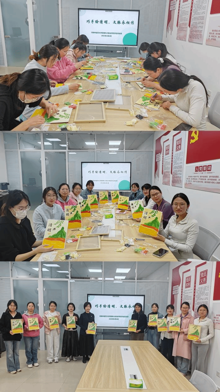 为传承中华优秀传统文化,弘扬清明节文化内涵,丰富支部文化生活,4月2日,河南中医药大学管理科大联合学院学生党支部在教学实验楼A725会议室,组织开展了“巧手绘清明,文脉永相传”纸浆画手工制作主题党日活动。